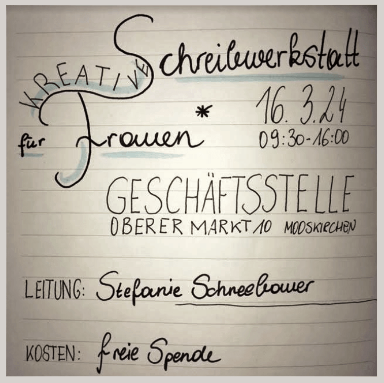 Du schreibst gerne oder möchtest es ausprobieren? Dann nimm an unserer Schreibwerkstätte am 16. März 2024 in der Geschäftsstelle Mooskirchen teil. An diesem Workshoptag tauchen wir gemeinsam in das Schreiben von Gedichten und kurzen Geschichten ein. Der Workshop ist sowohl für Anfängerinnen* als auch für Fortgeschrittene geeignet.